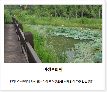 | 야생초화원 | 우리나라 산야에 자생하는 다양한 야생화를 식재하여 자연학습 공간 |
