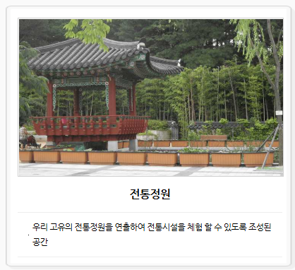 | 전통정원 | 우리 고유의 전통정원을 연출하여 전통시설을 체험 할 수 있도록 조성된 공간 |