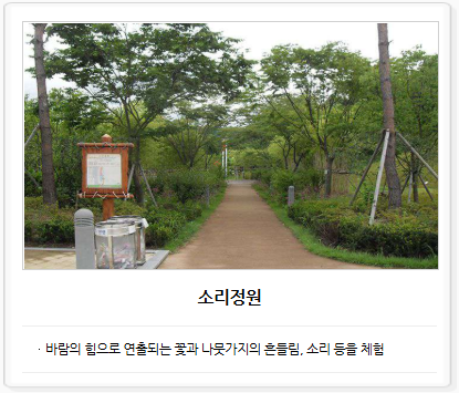 | 소리정원 | 바람의 힘으로 연출되는 꽃과 나뭇가지의 흔들림, 소리 등을 체험 |