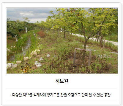 | 허브원 | 다양한 허브를 식재하여 향기로운 향을 오감으로 만끽 할 수 있는 공간 |